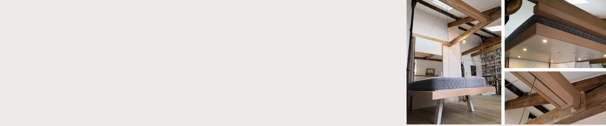 Si il n’y pas de possibilité de se fixer au plafond d’aucune manière, notre «solution poutres» consiste à s’affranchir du plafond en ancrant des poutres métalliques blanches dans les murs de la pièce, perpendiculairement ou parallèlement au bedUp®. Elles sont blanches et discrètes.