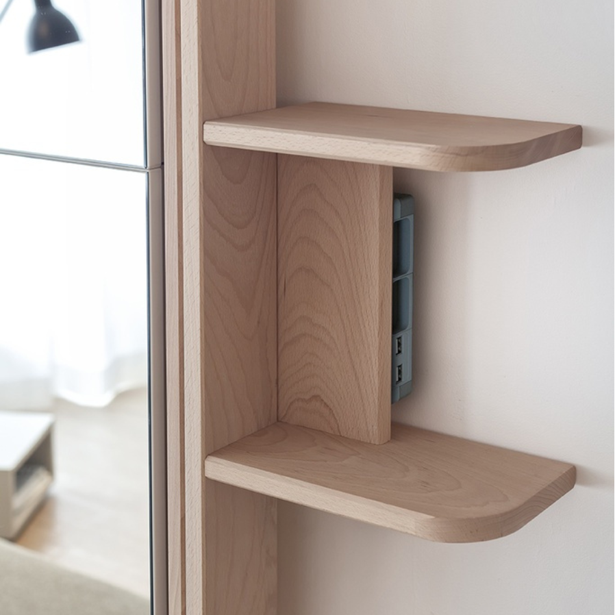 - Multiprise connectée (2 prises + 2USB) cachée par un rectangle de hêtre, est très pratique pour brancher lampes et appareils (passage des câbles sur le côté).