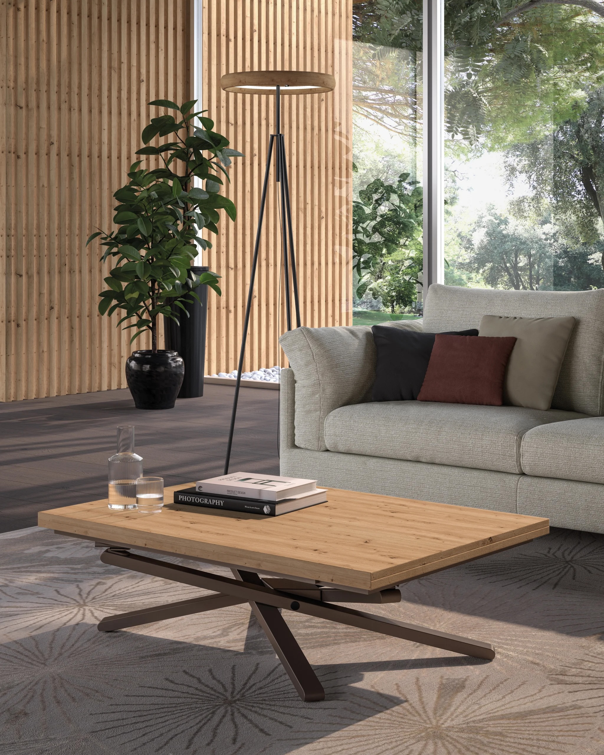 Combinaison parfaite de design et d’efficacité , ce meuble extraordinaire s’intègre harmonieusement avec le lieu de vie, tout en vous faisant gagner une place folle. La table basse relevable et extensible est un véritable meuble gain de place qui permet de nombreuses utilisations. Idéal pour le télétravail à la maison, elle se transforment en quelques secondes de bureau en table de repas et en table basse.