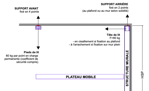 Schéma de principe de fixation d’un lit escamotable au plafond bedUp®